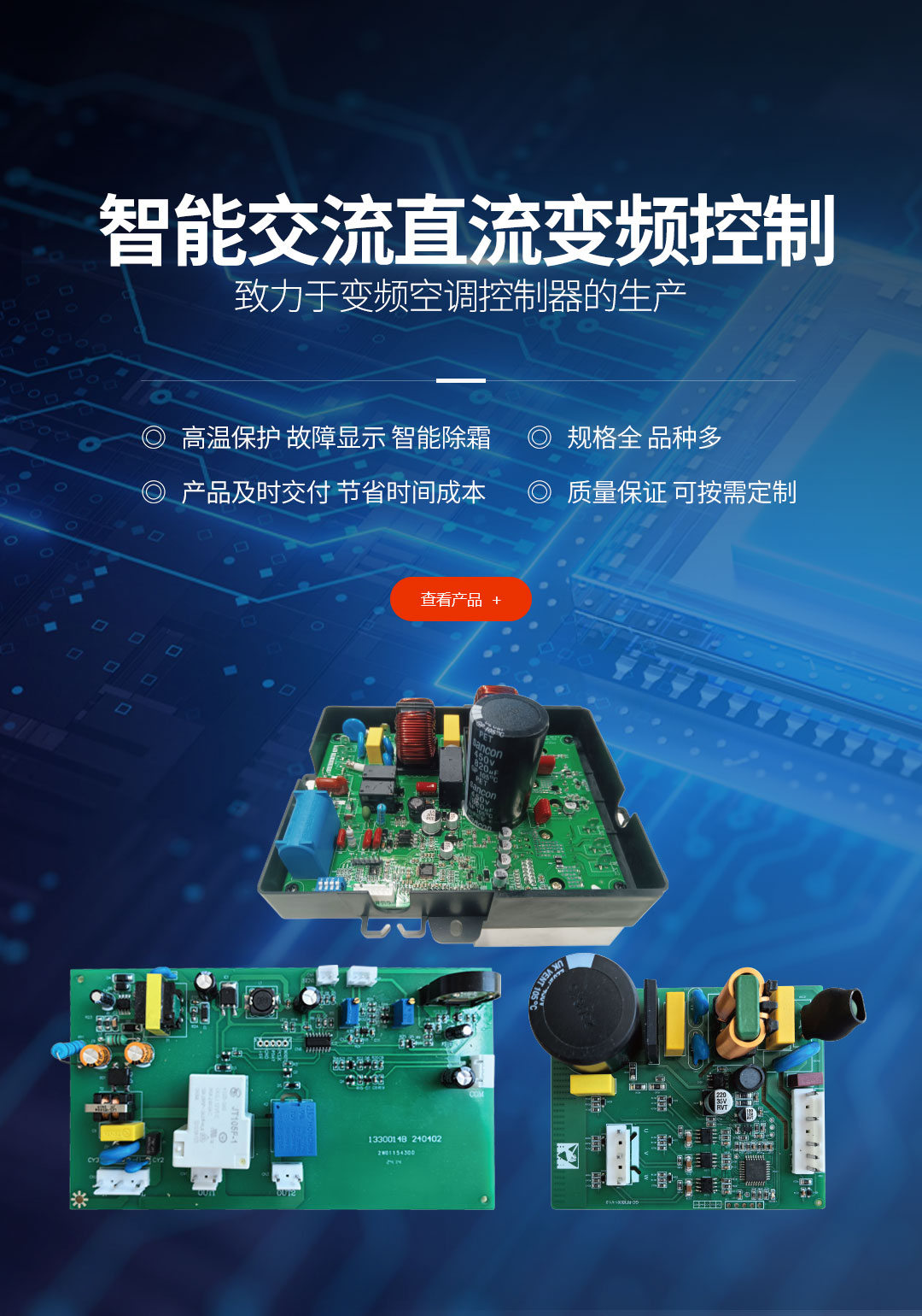 公司目前有多種專利,并具備生產(chǎn)及工藝技術(shù)。年產(chǎn)家電控制器一百萬套,產(chǎn)品廣泛用于空調(diào)、中央空調(diào)、電熱水器、冰箱、洗衣機、水暖毯、健身器材智能控制器等領(lǐng)域。目前是國內(nèi)變頻通用控制系統(tǒng)品牌。